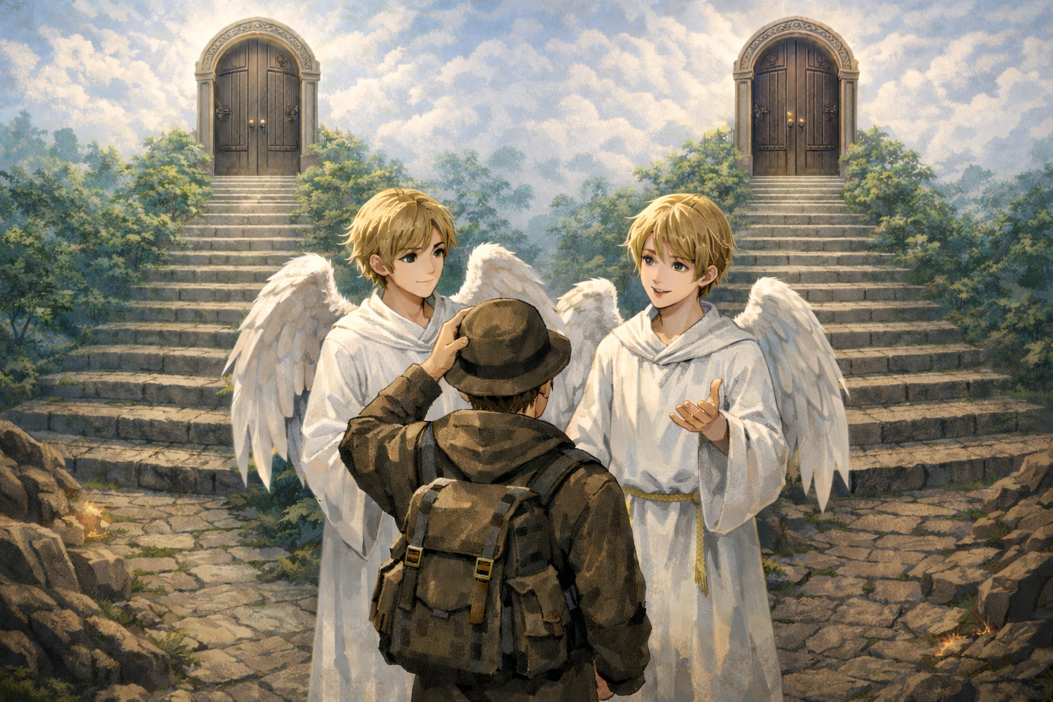 ということで、ネタバレします。ドラマでは、「あの扉(道)が天国へ通じるものだとしたら、あなたは「はい」と答えますか」ということでした。この絵でいくと、右の人に右側の扉を指して、この質問します。そして、右側が天国だとします。